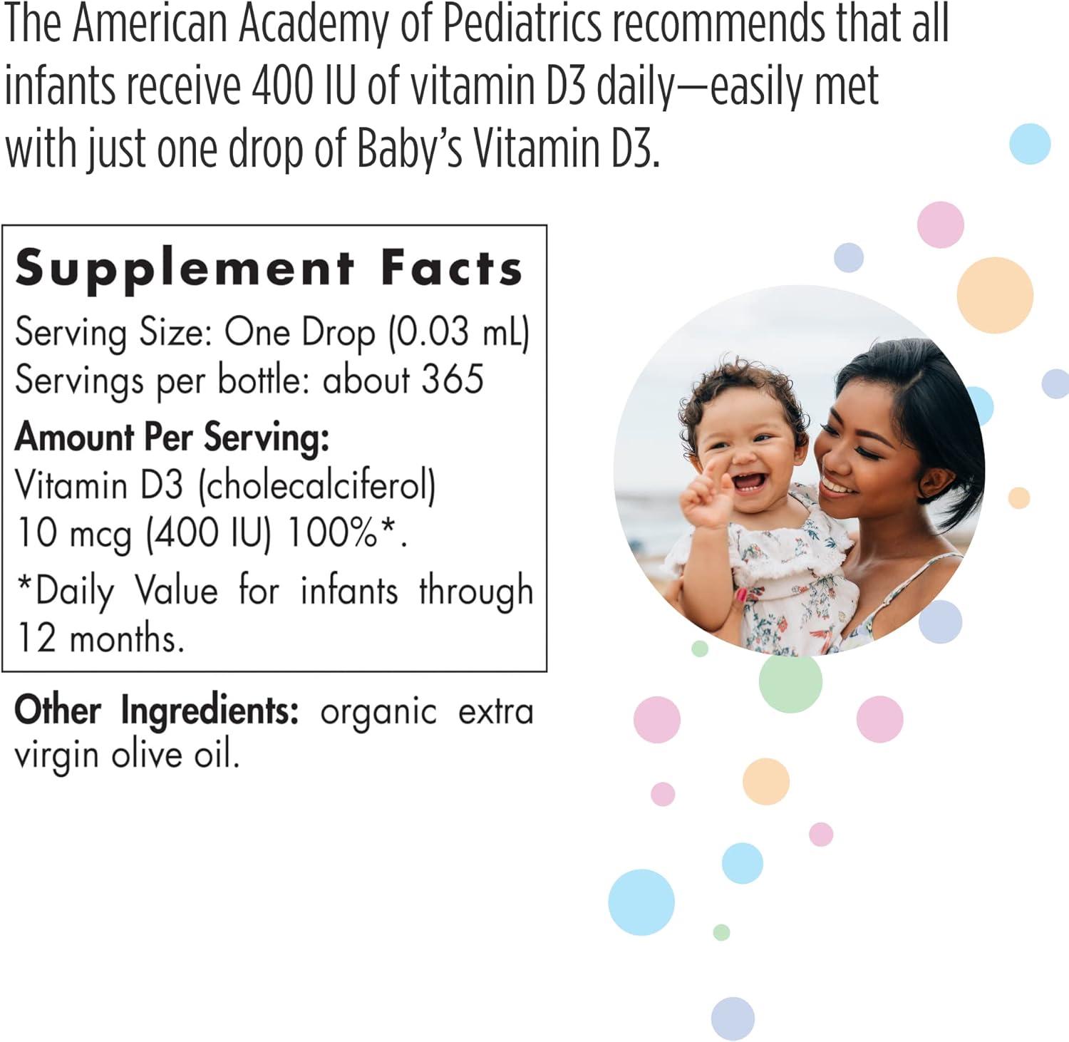 Doctor-Recommended; Contains 400 IU of Vitamin D3, the daily dose recommended by the American Academy of Pediatrics; Sun exposure isn't recommended for babies; Supplementing is a great way to make sure your baby is getting enough of this nutrient