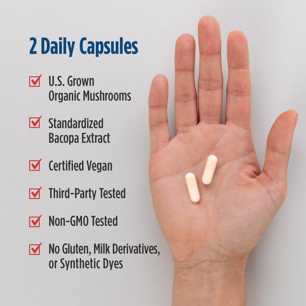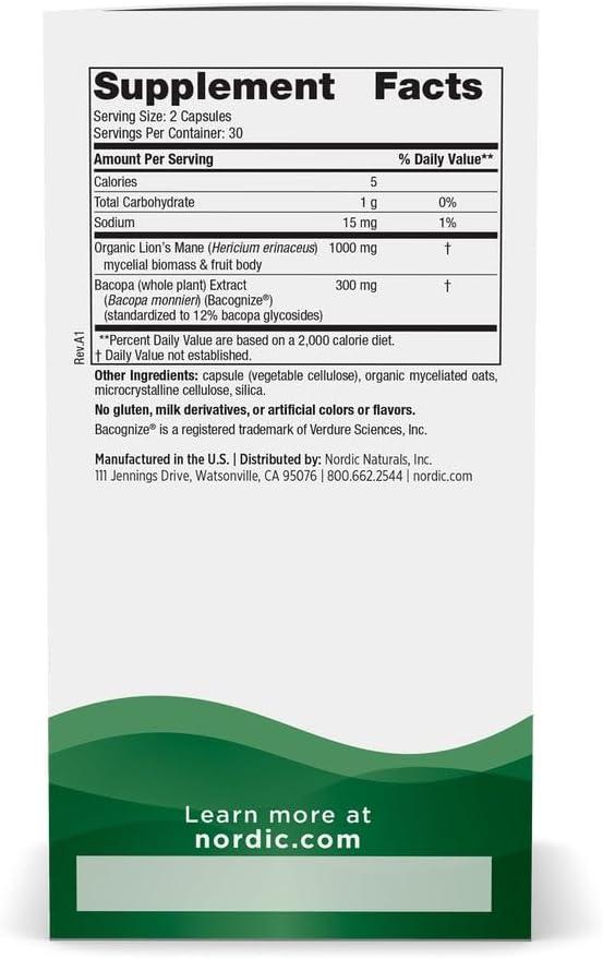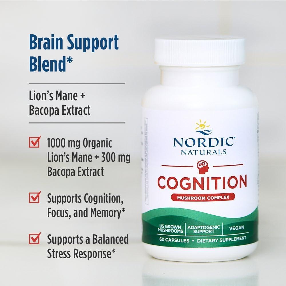 Nordic Naturals Cognition Mushroom Complex, Unflavored – 60 Capsules – Brain, Memory & Mood Support – Blend of Lion’s Mane Mushroom & Bacopa Extract – Non-GMO – Certified Vegan – 30 Servings