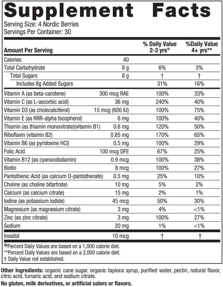 Daily Essential Nutrients; Nordic Berries provide ten of the most essential nutrients, including zinc and vitamins A, C, D3, and E.
