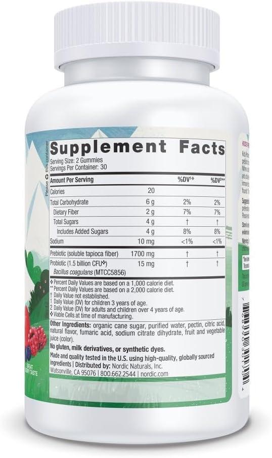 WHY PROBIOTICS – Kids Nordic Flora Probiotic Gummies provide a synergistic blend of probiotics & prebiotic fiber to help establish and maintain healthy digestive balance with 1.5 billion CFU per serving.